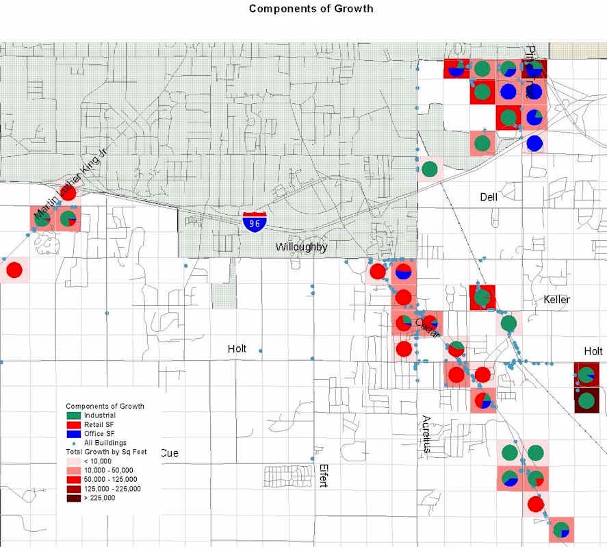 DELHI TOWNSHIP DOWNTOWN DEVELOPMENT AUTHORITY This map shows Delhi Township's growth and development during the 1990s. The pie charts show the distribution between industrial, retail and office while the depth of the red square indicates the total amount of square feet constructed in that area. Blue dots any non-residential structure.